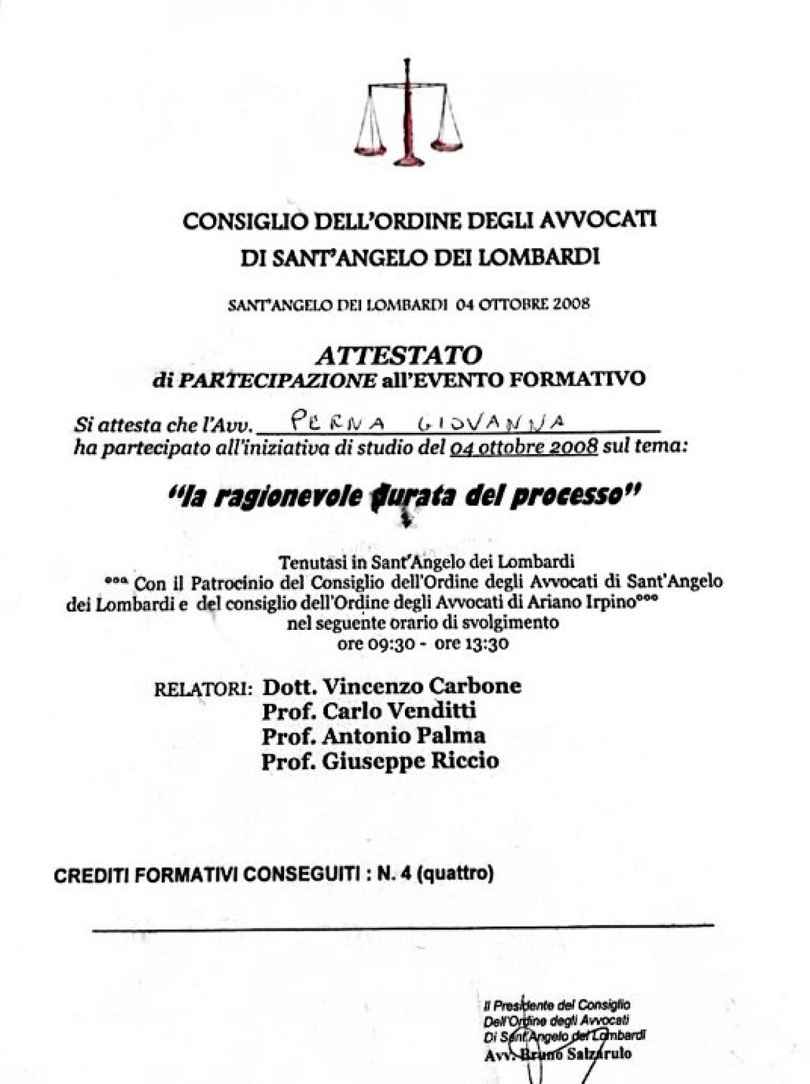 - Ottobre 2008 attestato di partecipazione “la ragionevole durata del processo”