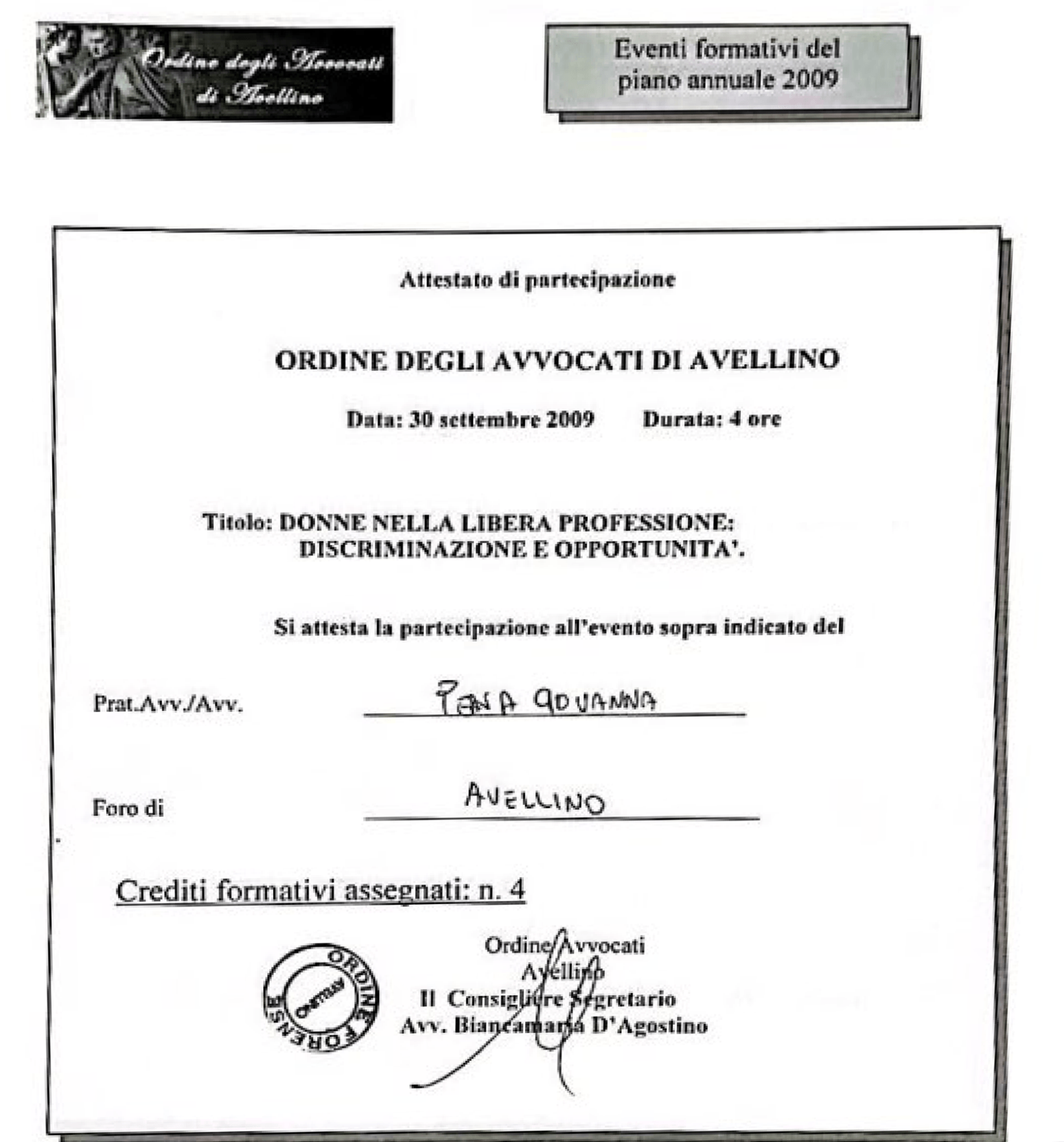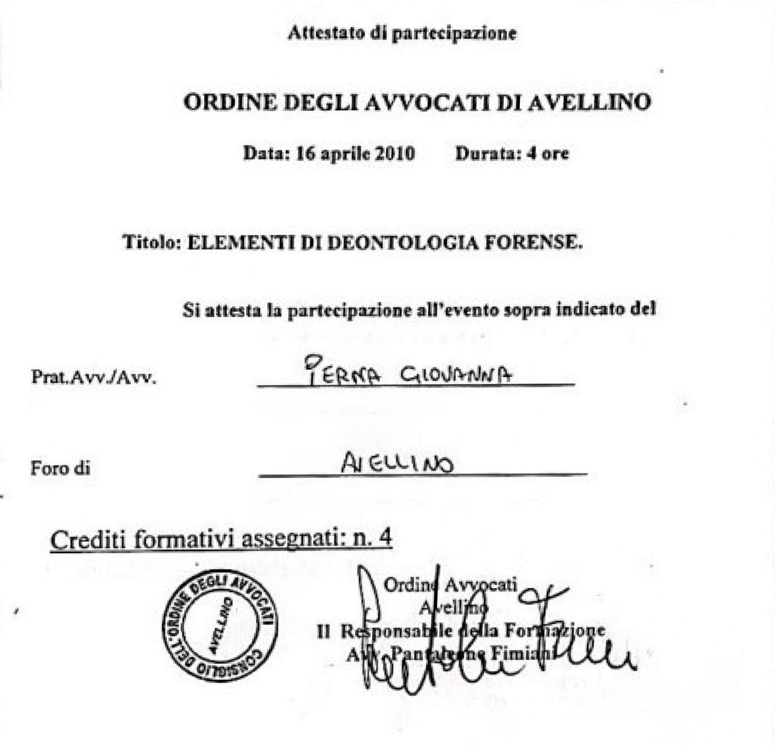 - Aprile 2010 attestato di partecipazione “elementi di deontologia forense”