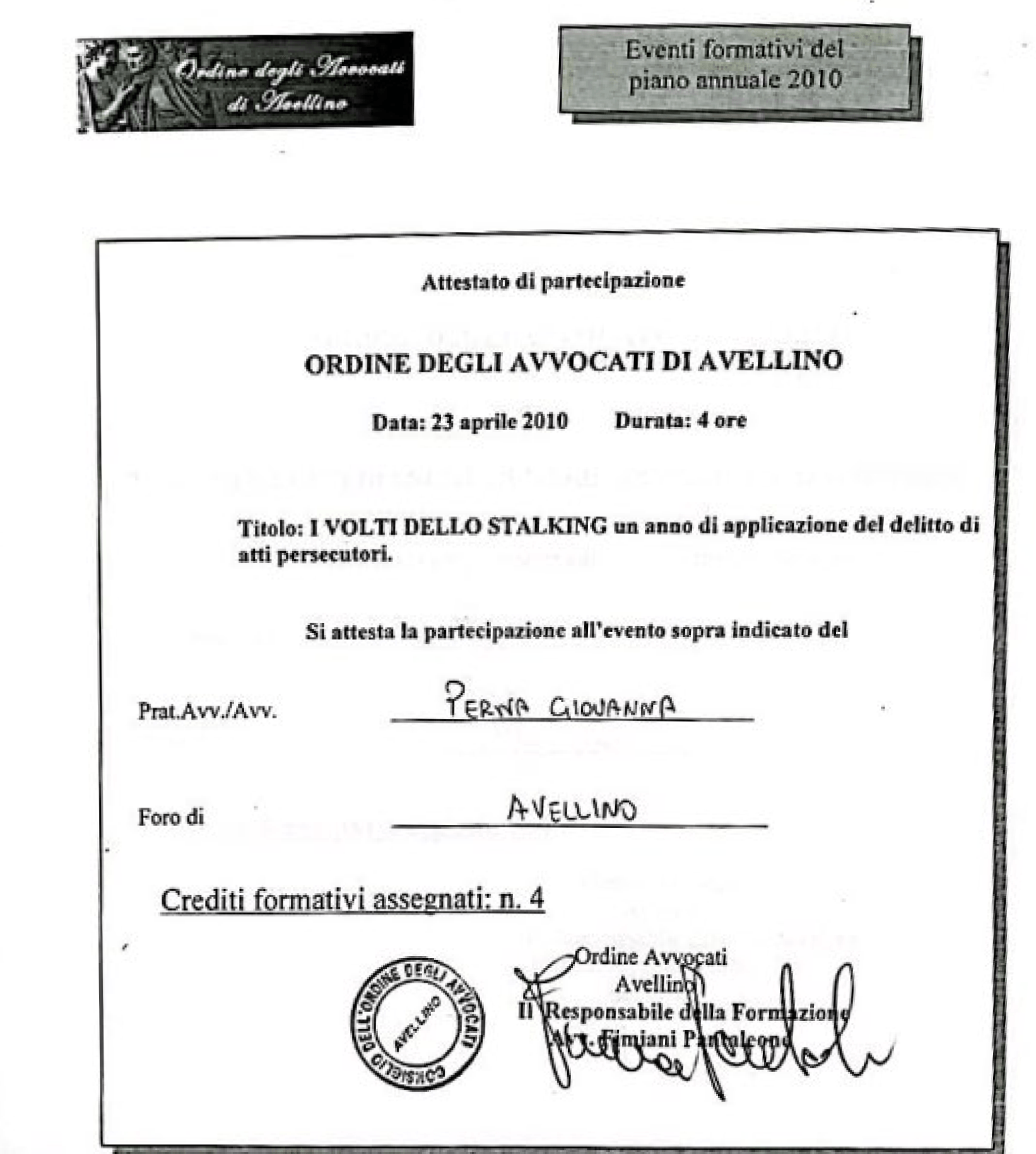 - Aprile 2010 attestato di partecipazione “i volti dello stalking, un anno di applicazione del delitto di atti persecutori