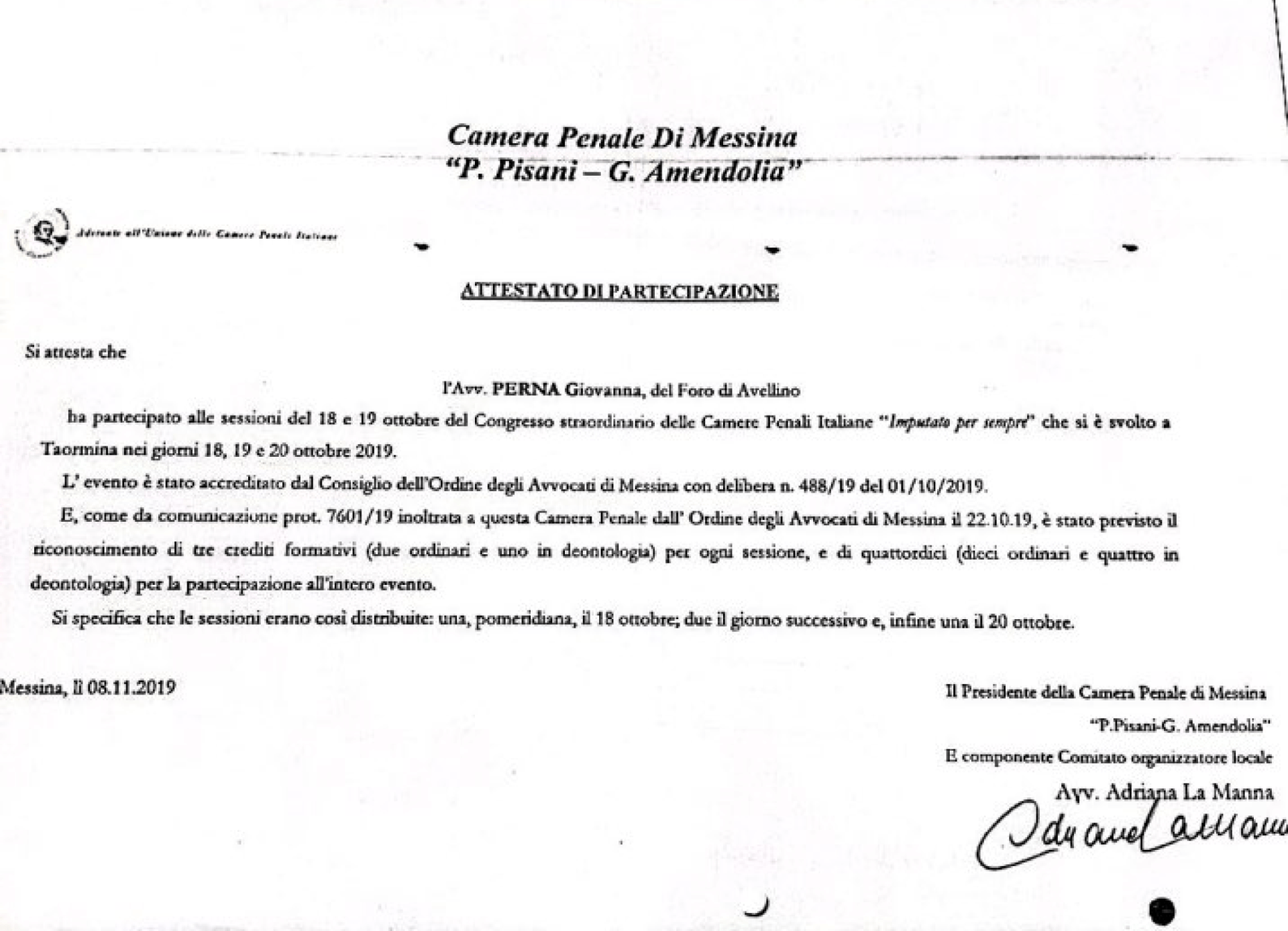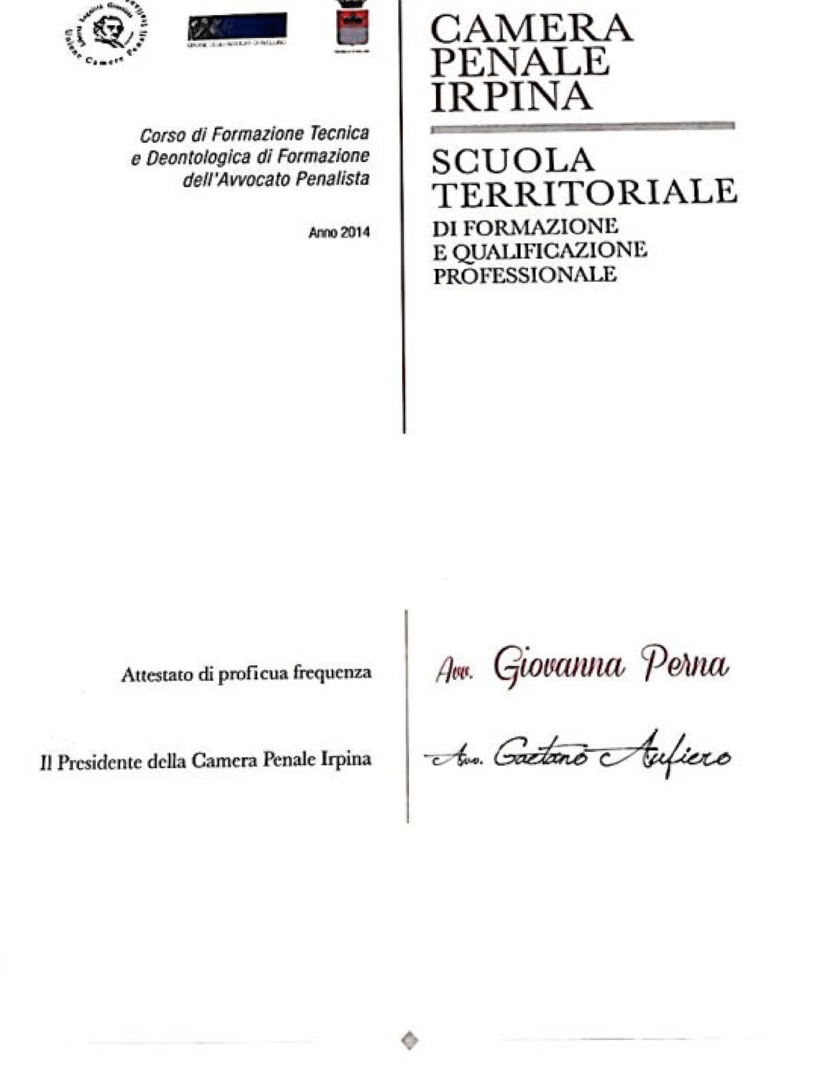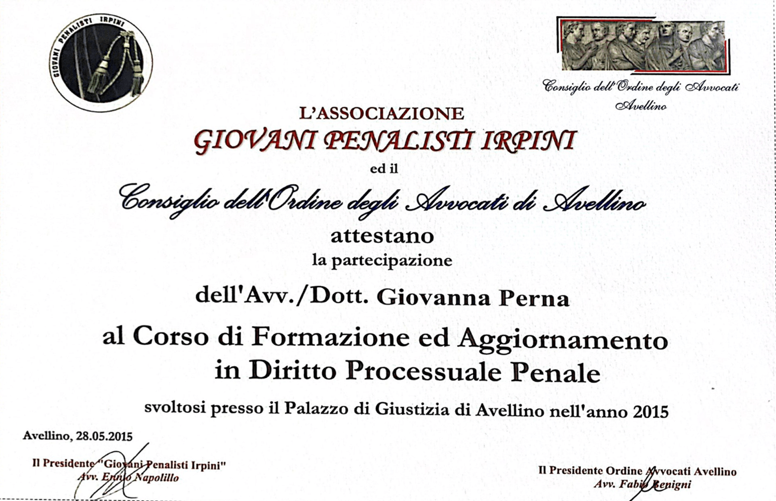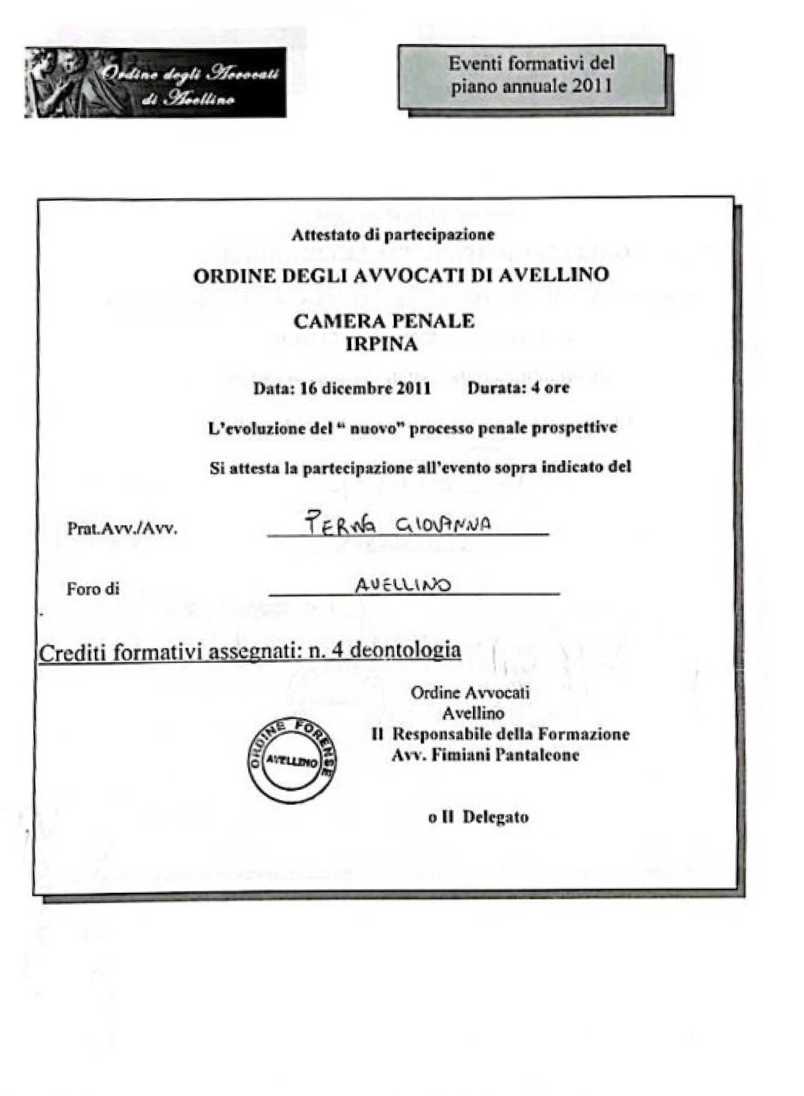 - Dicembre 2011 attestato di partecipazione “l’evoluzione del nuovo processo penale prospettive”