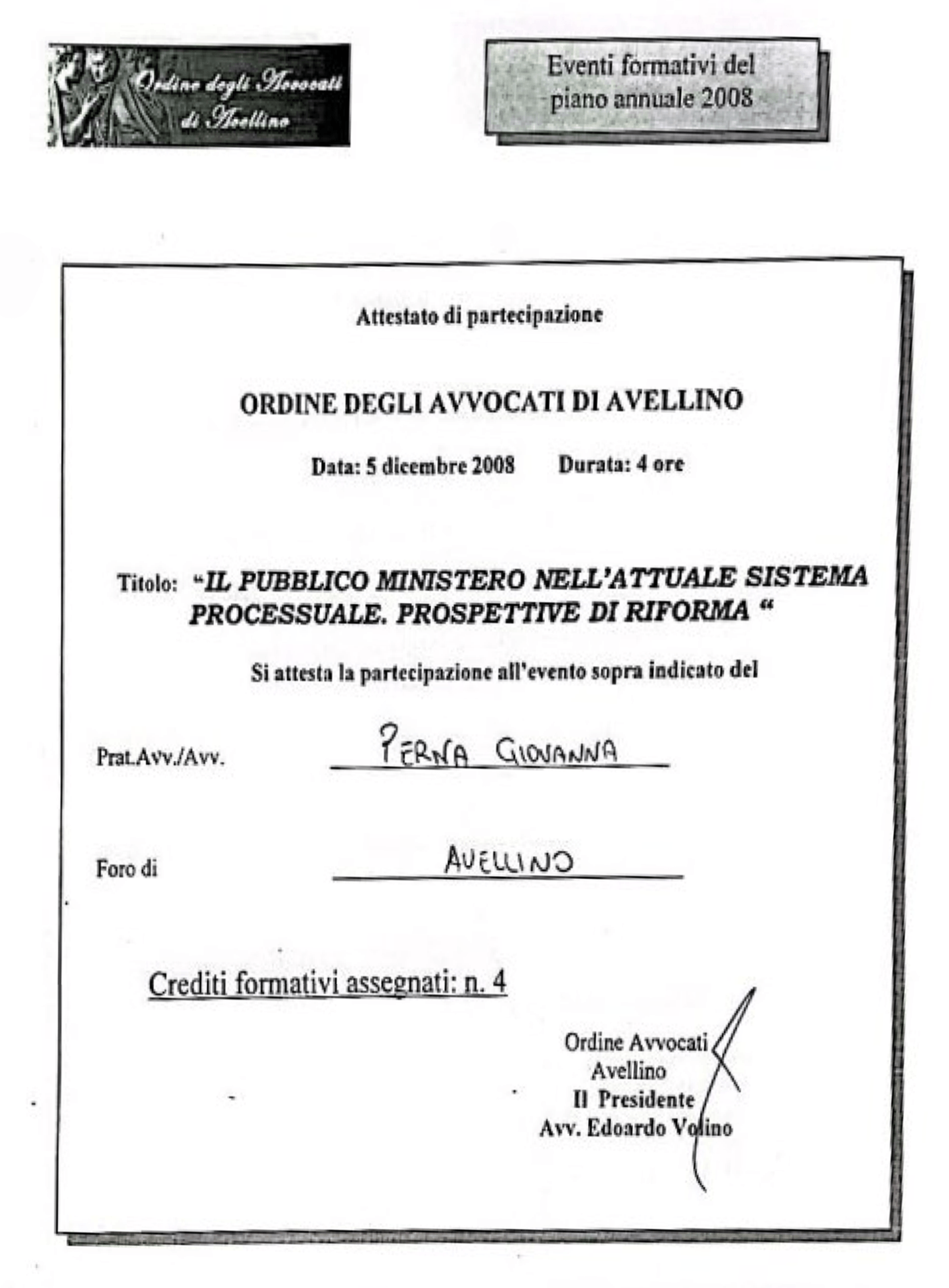- Aprile 2008 attestato di partecipazione “principio dispositivo, poteri officiosi e giusto processo nella formazione della prova penale”