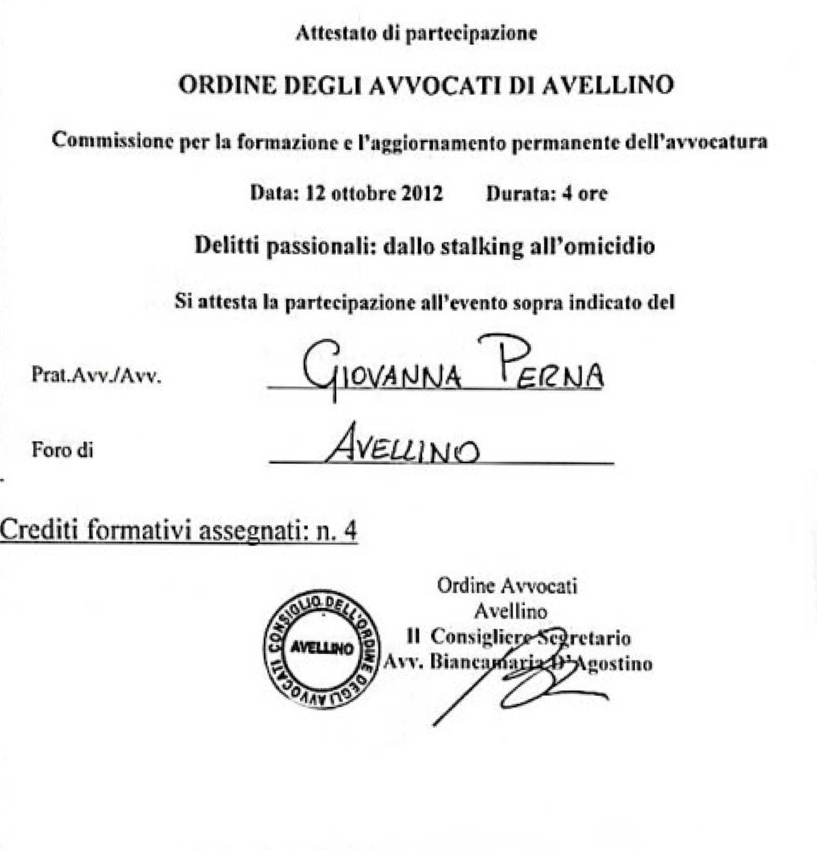 - Ottobre 2012 attestato di partecipazione “delitti passionali: dallo stalking all’omicidio”