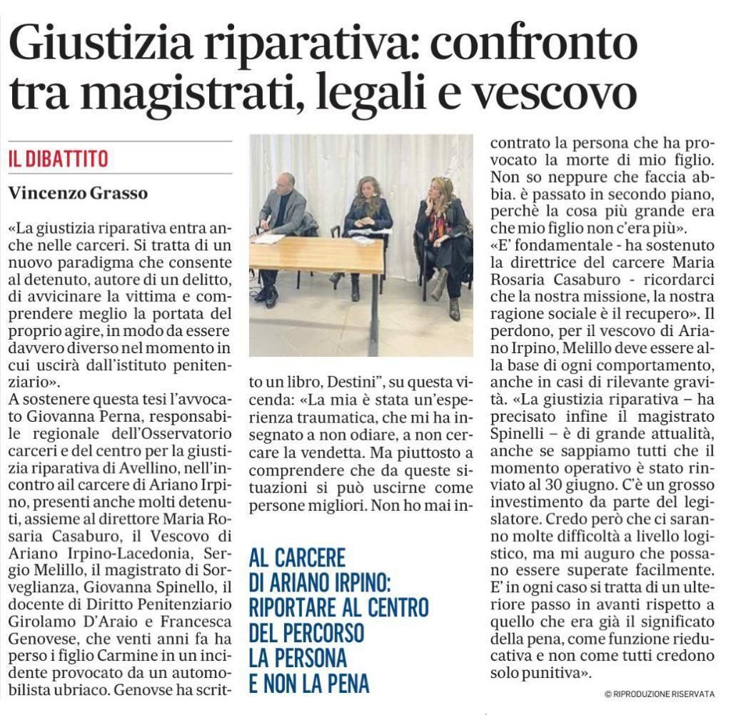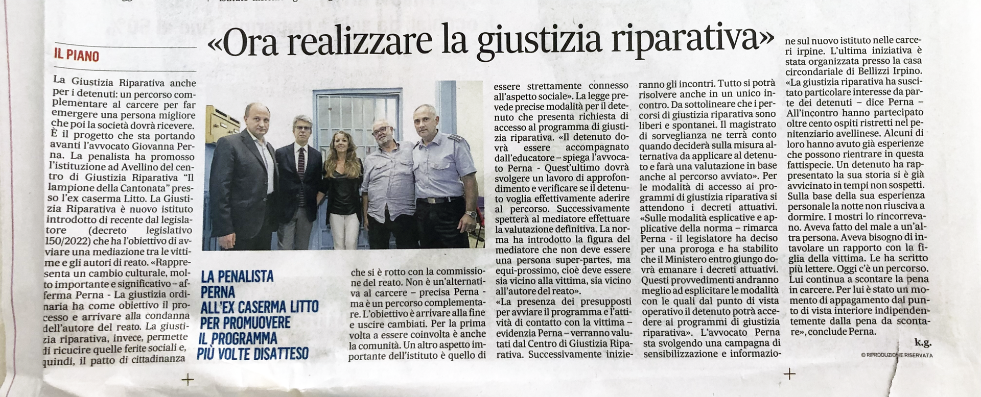 Ampio spazio al progetto ed in particolare al tema della Giustizia Riparativa, un “nuovo” modello che promuove consapevolezza, responsabilità e volontà di riparazione nei confronti delle vittime e della comunità. La testimonianza diretta del lavoro svolto grazie ad un progetto di sensibilizzazione sul tema, presentato dalla scrivente e che ha consentito di istituire con la Provincia di Avellino, la Caritas Diocesana, l’Ufficio Uepe, l’Ufficio del Garante Provinciale per le Persone Private della Libertà, il Centro Giustizia Minorile della Campania, il Centro di giustizia riparativa- Mediazione dei Conflitti e di aiuto alle Vittime di reato “il lampione della cantonata” e che mi onoro di coordinare.
